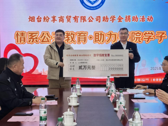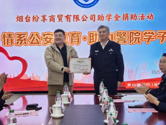 贺曙敏同志代表学校向烟台市纷享商贸有限公司颁发爱心捐赠证书并讲话,对该公司热心学生公益事业,积极开展学生资助活动表示感谢。他指出,教育是国之大计,社会各界共同支持学生完成学业,是践行社会责任的体现。此次捐助不仅切实解决学生实际困难,更传递了温暖与希望,积极营造了暖心育人育警的环境,激励受助学生积极向上、励志笃行,希望同学们更加珍惜来之不易的学习机会,将这份关爱转化为奋进的动力,坚定理想信念,刻苦学习训练,努力练就报国为民的过硬本领,矢志不渝做党和人民的忠诚卫士。